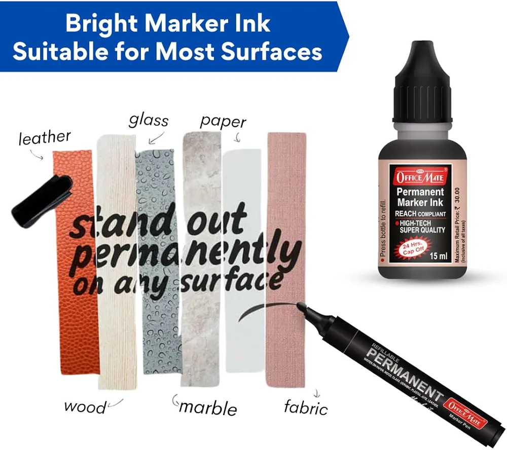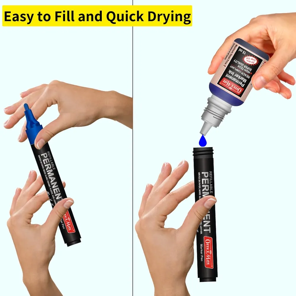 Effortless Refill System: Includes four bottles of refill ink (black, blue, red, and green), making it easy to replenish your markers and extend their usability.
